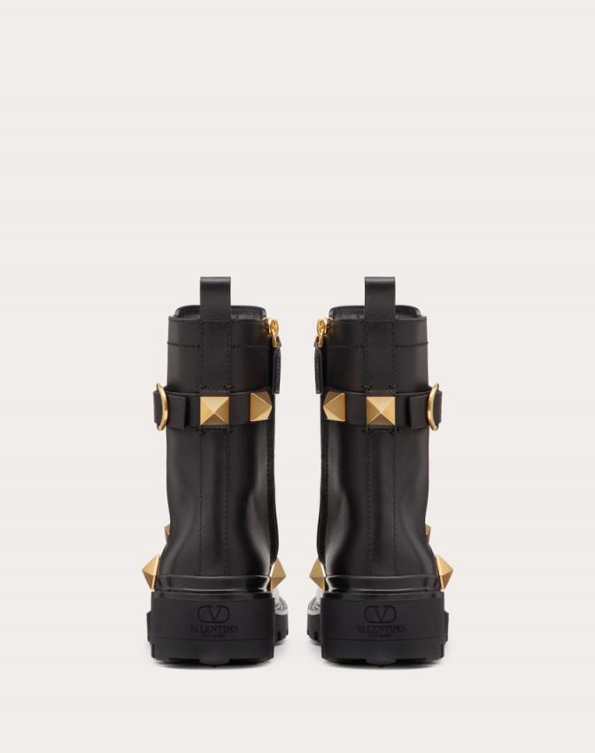 Valentino Garavani Roman Stud combat boot in calfskin with straps embellished with maxi studs. – 18×18 mm maxi studs with an antique-brass finish – Rubber sole with personalised with maxi stud relief design – Side zip fastening and strap with maxi buckle – Heel height: 40 mm/1.6 in. – Made in Italy