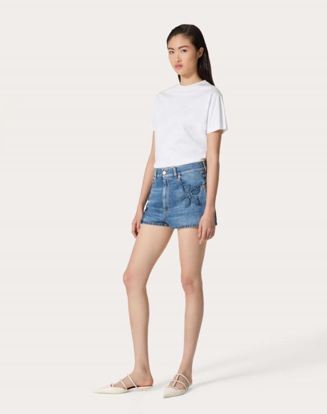 Medium Blue Denim Embroidered Shorts – Hibiscus embroidery detail – Medium Blue Denim (100% Cotton) – Unlined – Length: 27 cm / 10.6 in. from the waist in an Italian size 26 – Leg opening 30.5 cm / 12 in. in an Italian size 26 – Inseam 5.5 cm / 2.1 in. in an Italian size 26 – The model is 176 cm / 5’9″ tall and wears an Italian size 26 – Made in ItalyThe look of the model is completed by a Valentino Garavani VLogo Soft Bag and Valentino Garavani Rockstud Shoes.